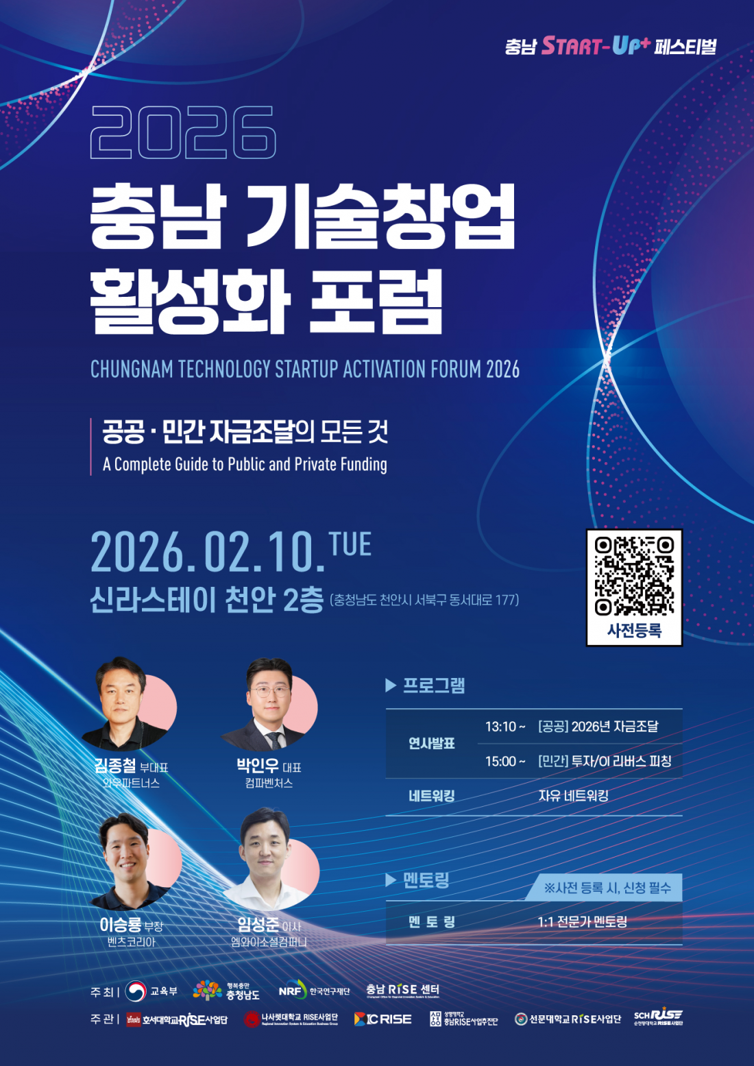 본 포럼은 충남 지역 기술창업 기업과 예비창업자를 대상으로 2026년 공공자금 조달 동향부터 민간 투자 및 IR 피칭 전략까지 실질적인 정보를 제공하기 위해 마련되었습니다.