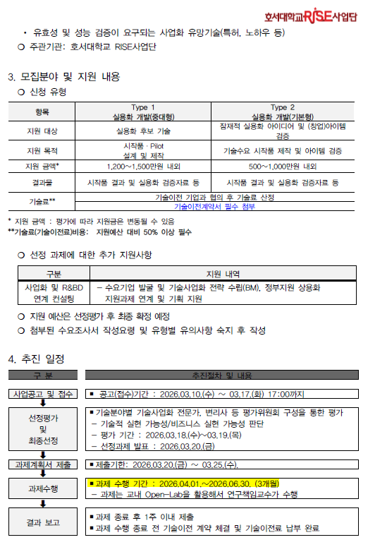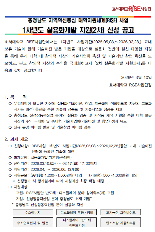 [산학협력센터] (기업대상) 1차년도 실용화개발 지원사업(2차) 신청 공고 관리자2026-03-10조회 40 첨부파일 [공고] 1차년도 실용화개발(2차) 신청 공고문.pdf (68.1 KB) 붙임1. 과제 수요조사서(최종수정본).hwp (135.0 KB) 붙임2. 개인정보 동의서.hwp (69.5 KB) 목록 이전글 [인재양성센터] 스마트모빌리티 융합전공 마이크로디그리 학생 모집 다음글 [인재양성센터] 2026학년도 창업동아리 모집 공고